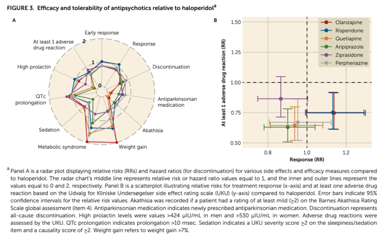 研究系统比较了七种常用抗精神病药物(奥氮平、利培酮、喹硫平、阿立哌唑、齐拉西酮、奋乃静和氟哌啶醇)在精神分裂症急性期阶段的疗效与不良反应, 图2 抗精...