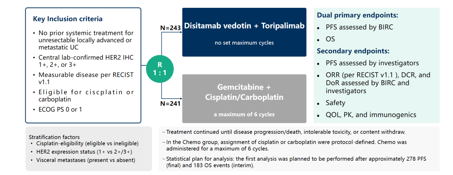 该项临床研究是一项在中国开展的开放标签、多中心、随机对照3期试验,旨在对比维迪西妥单抗与特瑞普利单抗联合方案与一线化疗方案(吉西他滨联合铂类化疗)用于既往未接受过系统治疗的HER2表达(定义为经中心实验室免疫组化检测HER2表达为1+、2+、3+)的晚期尿路上皮癌的有效性与安全性。筛选合格的受试者根据顺铂耐受(耐受vs不耐受)、HER2表达(IHC 1+ vs 2+/3+)以及内脏转移(有 vs 无)等分层因素,以1:1的比例随机分配至维迪西妥单抗与特瑞普利单抗联合疗法组,或吉西他滨联合铂类化疗组接受相应治疗,直至疾病进展或不能耐受,主要研究终点为独立评审委员会(Independent Review Committee,IRC)评价的无进展生存期(Progression-Free Survival,PFS)与总生存期(Overall Survival,OS),次要研究终点为研究者评估的无进展生存期、客观有效率以及安全性。