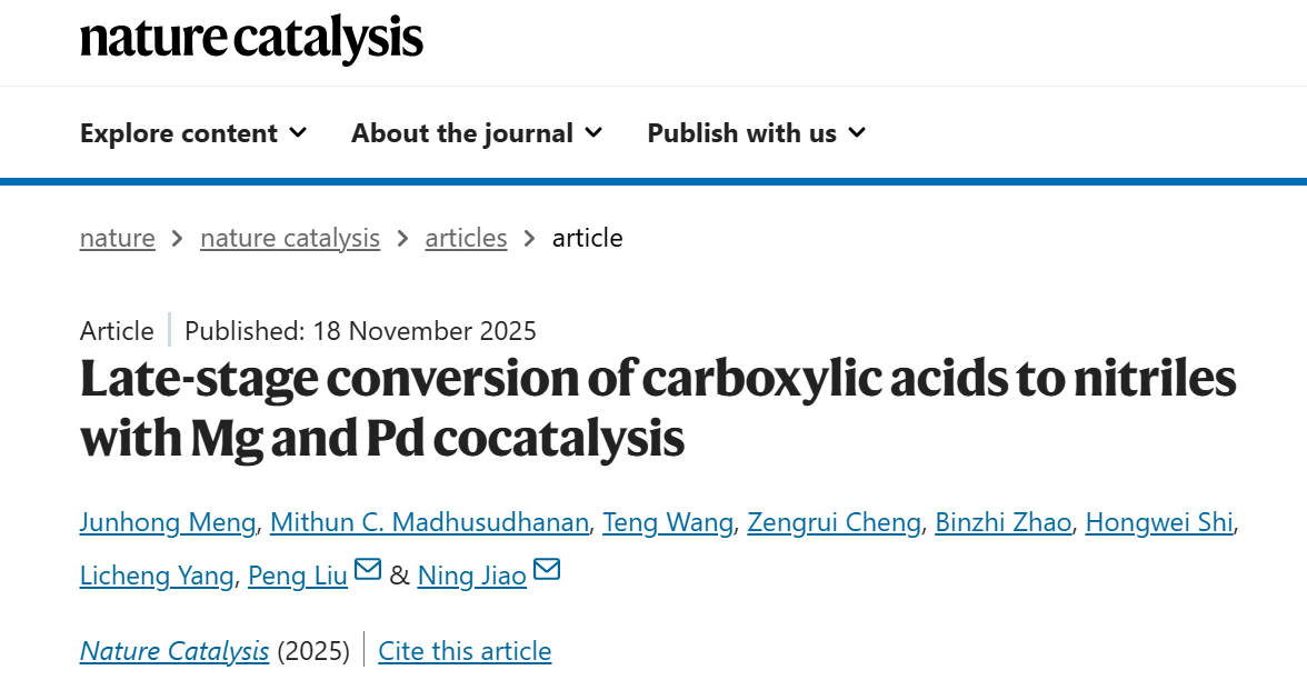 2025年11月18日,北京大学焦宁教授团队与匹茨堡大学刘鹏教授团队在Nature Catalysis上发表题为“Late-stage conversion of carboxylic acids to nitriles with Mg and Pd cocatalysis”(镁、钯共催化的羧酸到腈的后期修饰)的原创型工作。研究团队发展了一种以钯盐、镁盐协同催化、以尿素作为氮源的羧酸高效制备腈类产物的新方法。通过双金属协同催化与焓变-熵变综合驱动,该方法温和地活化了惰性羧酸并完成腈的生成这一热力学不利的转化,实现了多官能团复杂羧酸的后期氰化修饰。