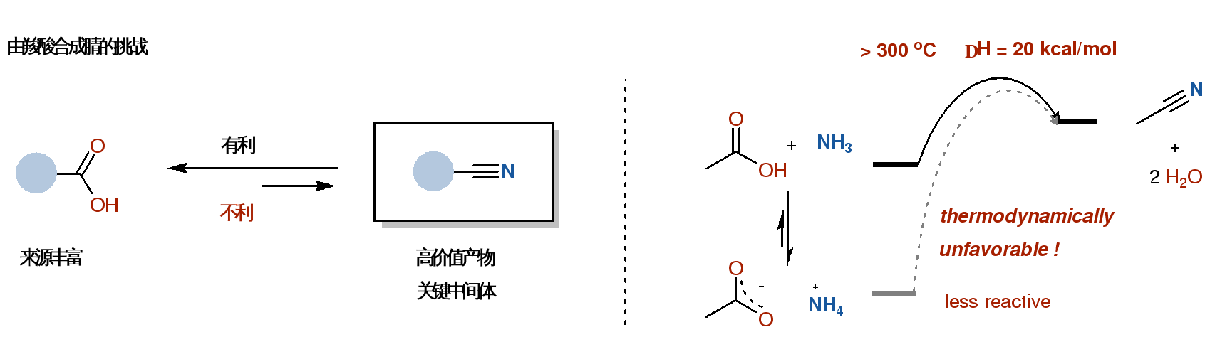 图2. 羧酸制备腈的挑战