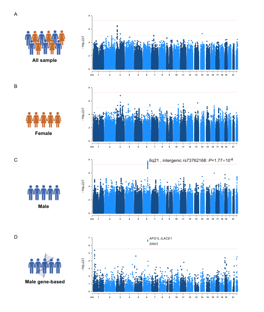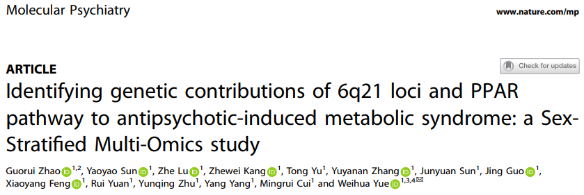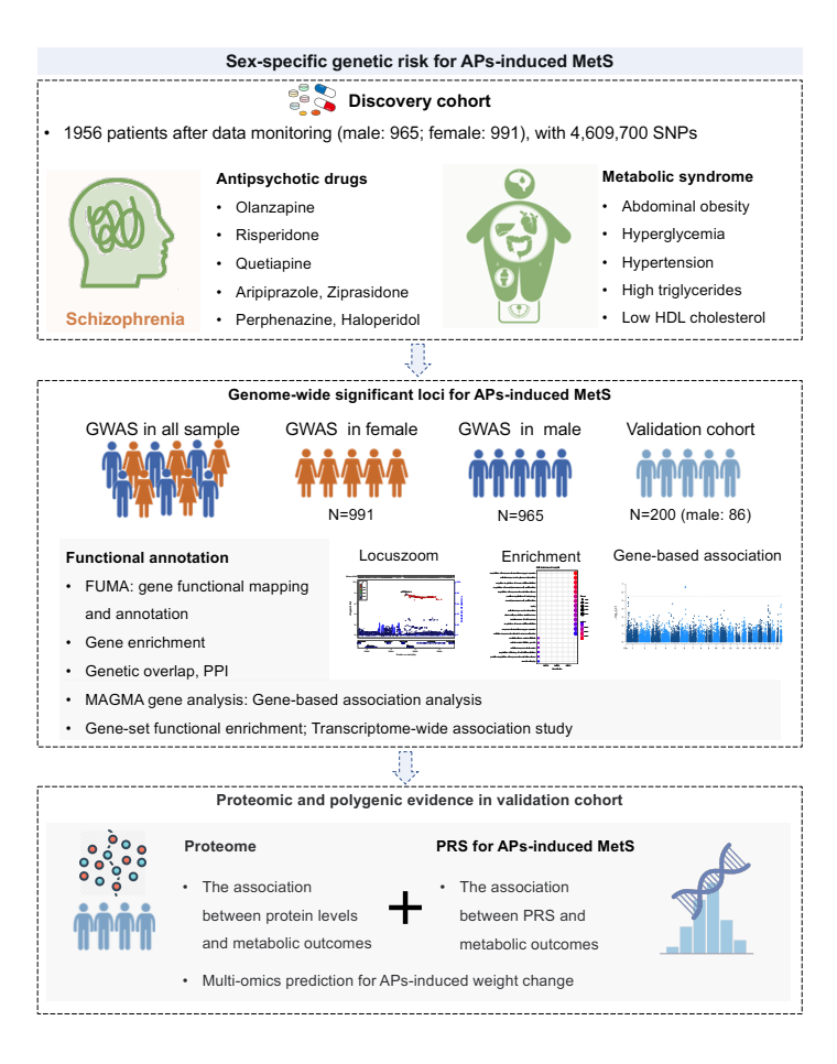 抗精神病药物是精神分裂症的一线治疗药物,但与代谢综合征(Metabolic syndrome, MetS)风险显著增加相关,其患病率估计在22.4%至63%之间,是普通人群的2至3倍。抗精神病药物诱发的代谢综合征(Antipsychotics-induced metabolic syndrome, APs-induced MetS)患者面临2型糖尿病、心血管疾病和其他代谢相关疾病的高风险,并严重损害其长期预后。然而,目前对于APs-induced MetS的遗传风险因素仍知之甚少。既往关于代谢不良反应的研究多聚焦于单一指标(如体重增加),且多为横断面研究,纵向遗传学研究在揭示因果关系和识别治疗早期生物标志物方面具有巨大潜力。此外,性别不仅会影响MetS的患病率,而且影响患者对抗精神病药物的治疗反应,男性和女性的MetS诊断标准亦有所不同。因此,为了识别APs-induced MetS的性别特异性遗传易感机制,助力早期风险预测和个体化治疗,北京大学第六医院岳伟华课题组在既往研究的基础上开展了药物基因组学分析。