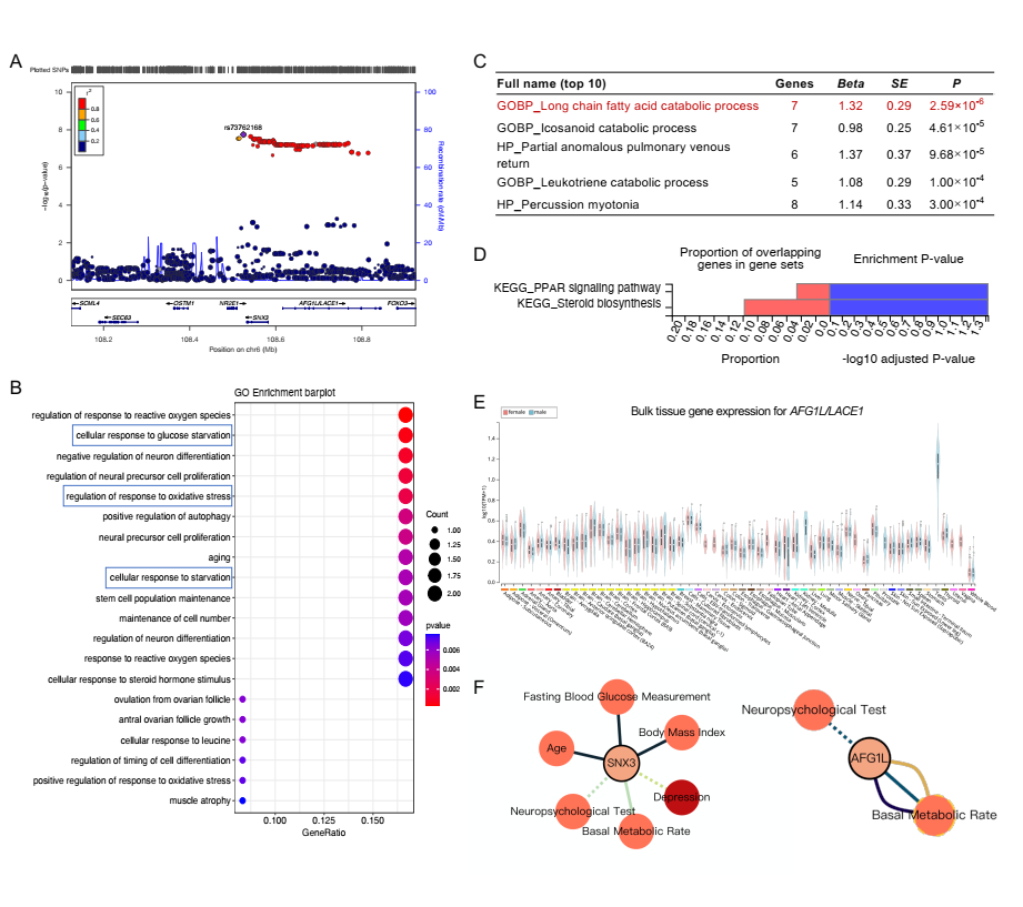 GWAS在6q21区域识别出一个显著的遗传变异(rs73762168),与男性患者APs-induced MetS显著相关。该位点位于一个包含NR2E1、SNX3和AFG1L/LACE1的连锁不平衡区域(图3)。在独立的多组学验证队列中(N=200),rs73762168基因型以及SNX3的基线蛋白丰度与体重和腰围增加显著相关。基于基因的关联分析进一步验证了SNX3和AFG1L/LACE1的关联,其基因集富集于长链脂肪酸代谢通路。