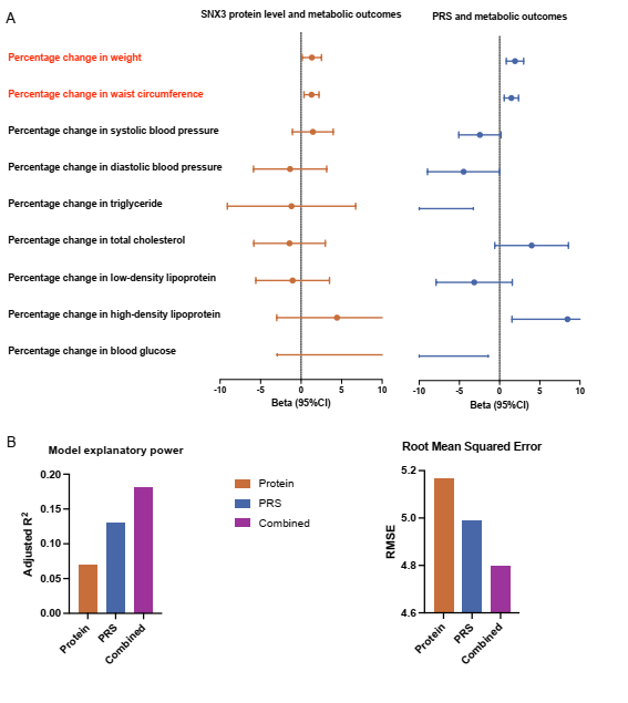 在验证队列中构建个体APs-induced MetS的多基因风险评分(polygenic risk score, PRS),结果表明PRS与体重和腰围变化显著相关。当将基线SNX3蛋白水平与PRS结合时,多组学整合模型的预测效能优于单独使用PRS或SNX3的模型,且对体重增加的解释力更高(图5),突显了整合多组学数据预测抗精神病药物不良反应的优势。