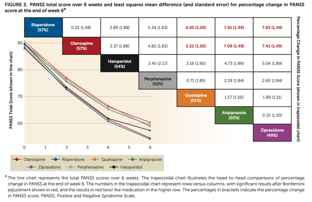 SINO研究在全国32家医院开展,共纳入3067例急性期精神分裂症患者,是目前亚洲人群样本量最大、头对头比较、多中心、随机、评估者盲的抗精神病药物临床试验。通过开展6周抗精神病药物治疗,研究系统比较了七种常用抗精神病药物(奥氮平、利培酮、喹硫平、阿立哌唑、齐拉西酮、奋乃静和氟哌啶醇)在精神分裂症急性期阶段的疗效与不良反应。研究主要结果如下:
