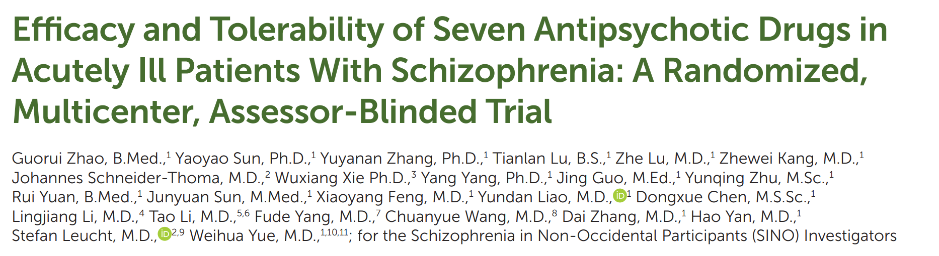2025年10月29日,研究结果Efficacy and Tolerability of Seven Antipsychotic Drugs in Acutely Ill Patients with Schizophrenia: A Randomized, Multicenter, Assessor-blinded Trial发表于精神医学高影响力期刊The American Journal of Psychiatry。北京大学第六医院岳伟华教授为文章最后通讯作者,北京大学第六医院阎浩教授、张岱教授,以及德国慕尼黑工业大学Stefan Leucht教授为共同通讯作者。北京大学第六医院赵国瑞博士研究生、孙瑶瑶副研究员、张于亚楠副研究员为共同第一作者。SINO全体成员为本研究做出了重要贡献。SINO研究论文一经上线,即引起来自美国、德国、日本、阿根廷等世界各地学者的关注,并获得高度评价。